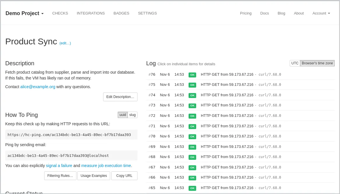 Healthchecks.io est un service de monitoring des tâches planifiées et des processus similaires. En écoutant les requêtes HTTP ("pings") provenant des tâches planifiées, Healthchecks.io surveille la santé des applications et génère des alertes en cas de défaillance. Avec sa simplicité d'utilisation et sa prise en charge de l'équipe et de l'API, Healthchecks.io simplifie la surveillance des tâches planifiées pour les équipes DevOps.